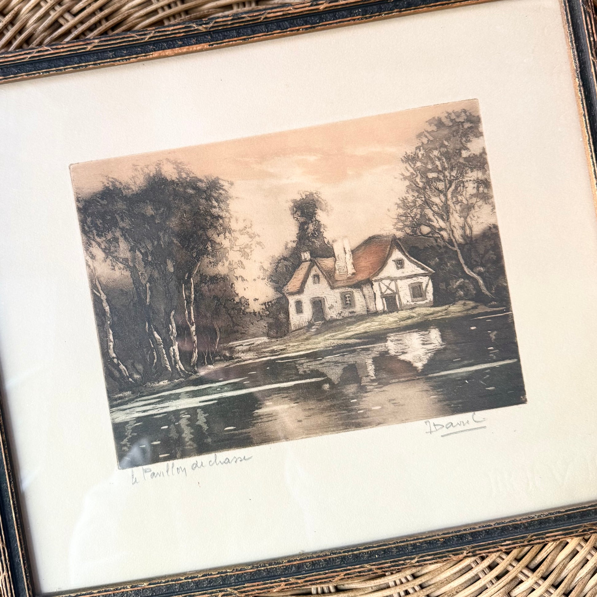 A French rural landscape hand colored etching, signed by the artist Louis Davril. Late 20th century.