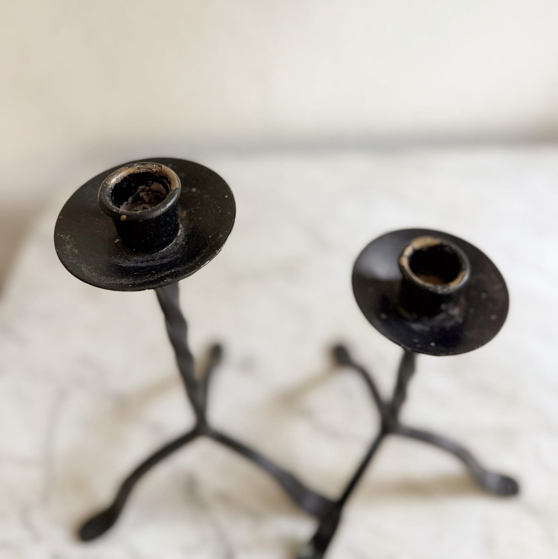 Lightweight iron candleholders with a twisted stem. Slight wear around the opening for the candle.