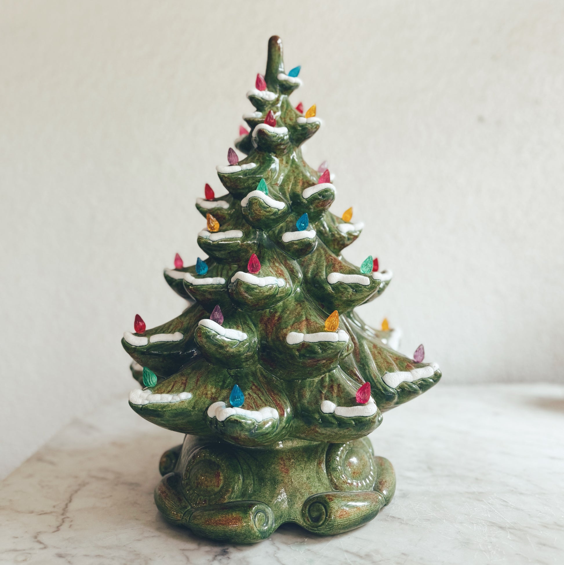 This tree is so gorgeous and in excellent condition. It is only missing one colored plastic peg light. The detail on the base is stunning. If colored lights are not your preference then they could always be changed to clear/white plastic pegs. In excellent condition without any chips or breaks.